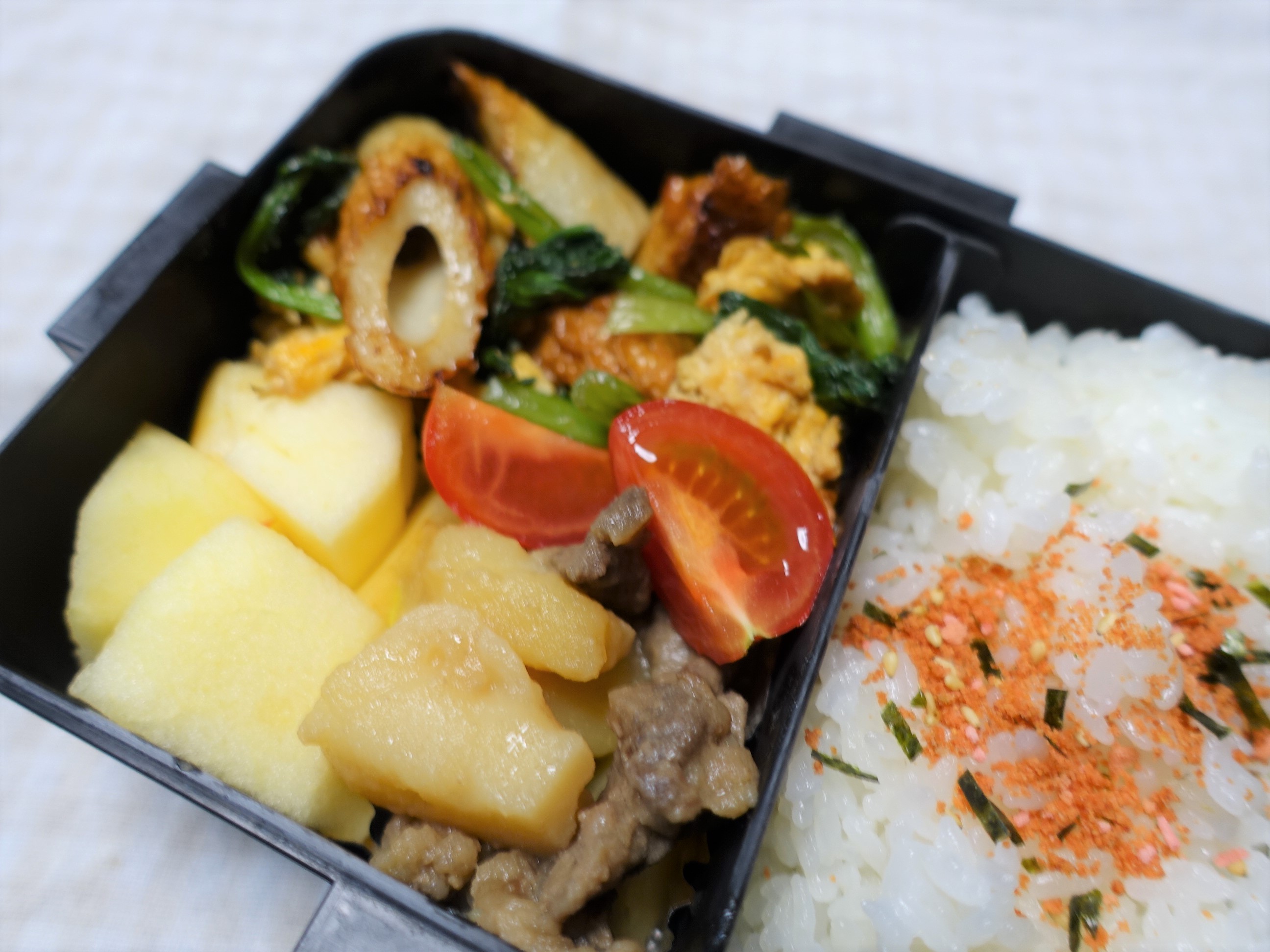 我が家の弁当づくりで心がけていることやレシピをご紹介いたします。今回は「竹輪と卵、小松菜の炒めもの」がメインディッシュです。